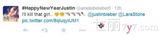 大片中,比伯半裸上身,超模劳拉从后背抱住比伯,抚摸着比伯的胸膛,这一举动惹怒了比伯的粉丝们,让她们嫉妒愤恨不已。其中一位粉丝@ameliebelieber6如此写道,“'ll kill that girl..(我要杀了那个女孩)”,后面插入两个人头,再加上几把枪和一把刀。还有更多比伯粉丝给超模发去了侮辱性的信息。