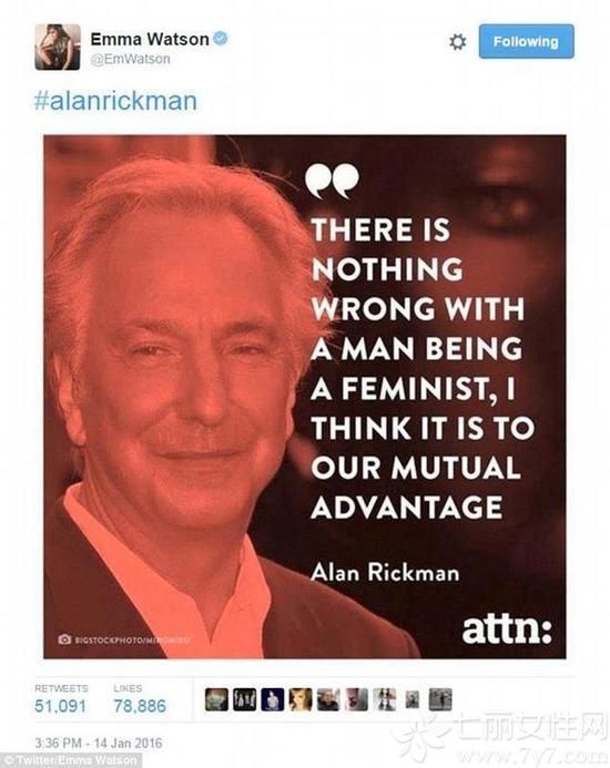 1月14日,在电影《哈利·波特》中饰演斯内普教授的英国男星艾伦·里克曼因癌症病逝,在《哈利·波特》中扮演赫敏的艾玛·沃特森在推特上发表哀悼,同时引用了艾伦生前支持女性主义的一段话,未料此举遭网民批评“:根本是在消费死者”。