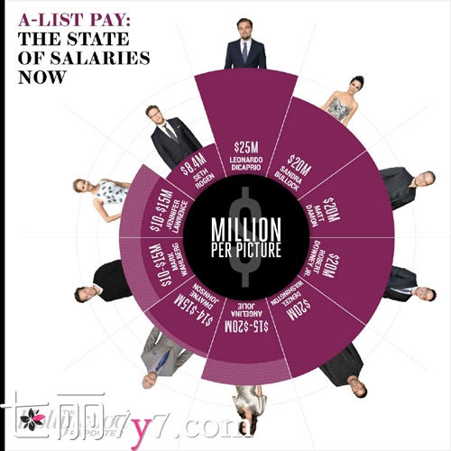 “小李子”莱昂纳多以2500万美元领跑。除此之外2000万美元俱乐部还包括小唐尼、马特·达蒙、丹泽尔·华盛顿、桑德拉·布洛克、安吉丽娜·朱莉。“钱老板”查宁·塔图姆、“巨石”强森在1500万美元档。“大表姐”詹妮弗·劳伦斯和马克·沃尔伯格在1000万美元档。