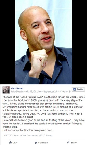 范·迪塞尔近日于Facebook上作出回应,称导演迟迟未定是因为需要谨慎考虑。此外,称“速激”未来还有三部曲,并许诺在下一条消息中公布导演。