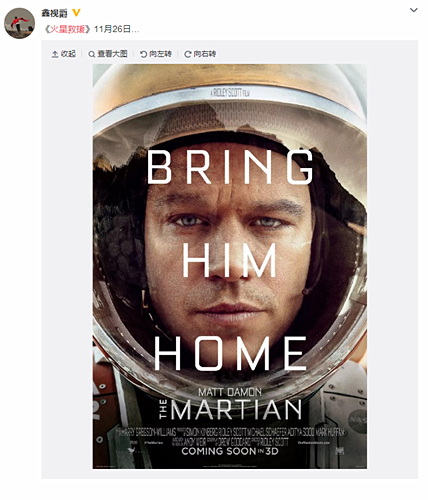 有望于11月登陆中国内地市场的《火星救援》近日被曝将于11月26日在内地上映。