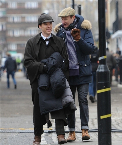 《神探夏洛克》第四季圣诞特辑再曝全新片场图,卷福本尼迪克特·康伯巴奇戴小帽十分显帅,粘着假胡子的华生马丁·弗瑞曼非常有喜感。