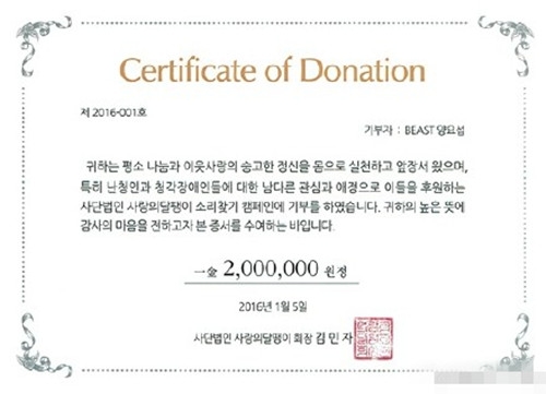 5日,某慈善机构表示“BEAST成员梁耀燮的后援团Supporters为庆祝1月5日梁耀燮生日,以他的名义向生活困难的听力障碍儿童们捐款200万韩元。”据悉,该团体自2013年以来每年都会以捐款的方式为梁耀燮庆生。