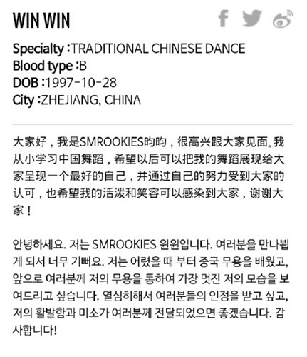5日,SM新公开SMROOKIES中国成员--昀昀(WIN WIN)!1997年出生,来自中国浙江,“大家好,我是SMROOKIES昀昀,很高兴跟大家见面。我从小学习中国舞蹈,希望以后可以把我的舞蹈展现给大家呈现一个最好的自己,并通过自己的努力受到大家的认可,也希望我的活泼和笑容可以感染到大家,谢谢大家”!