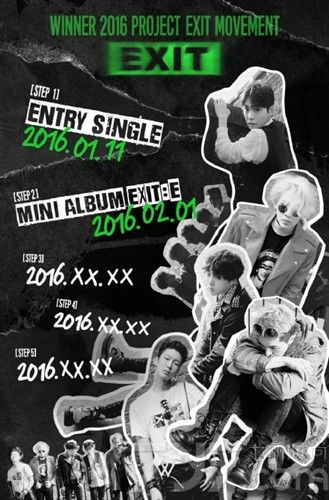 韩国时间7日上午11时YG通过官方Blog正式公开了WINNER2016年度回归计划预告照,根据预告照WINNER将于本月11日公开先行曲,并将于2月1日正式发表迷你专辑《EXIT》,随后的第3-4-5项回归计划也将陆续公开,令人期待!