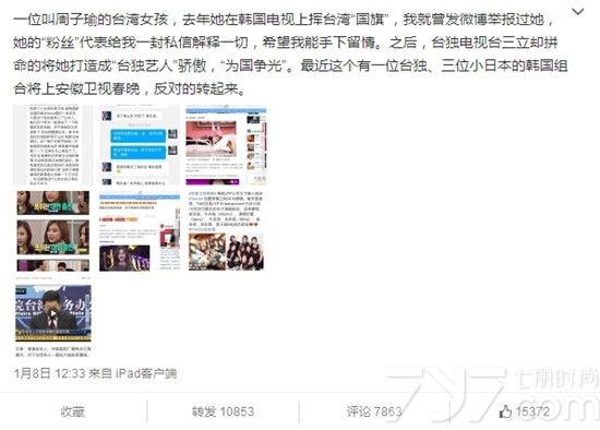 此前,黄安发出的微博截图中就出现,疑似周子瑜后援团在脸书中表示“子瑜是台湾人,并不是中国人,台湾本来就是一个国家……”日前,周子瑜与团体里的日本成员SANA、MINA及 MOMO一起上节目,眼尖的台湾网友发现她手拿台湾"国旗"录像,引发追捧,称周子瑜是"台湾之光"。