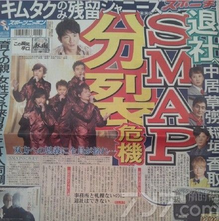 日本杰尼斯天团SMAP成军27年,在演艺圈的地位一直屹立不摇,13日却被日媒以头版爆料解散,除了木村拓哉(43岁)留继续留在杰尼斯事务所外,其他四人都将脱离事务所独立.
