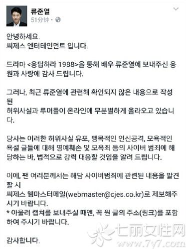 18日,柳俊烈经纪公司通过SNS表示“谢谢大家通过电视剧《请回答1988》给柳俊烈的支持和爱。但是最近在网络上传播着许多关于柳俊烈的虚假消息,散布谣言,盲目的人身攻击是损害他人名誉的网络犯罪行为。”