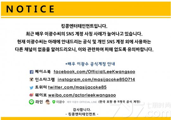 18日,KINGKONG娱乐通过官方脸书发布了李光洙官方账号的声明,声明中说道:“近来,冒牌李光洙账号在SNS上十分猖獗。现在公司正式公布李光洙的官方及个人SNS账号。除这些账号外均为假冒,希望大家注意。”