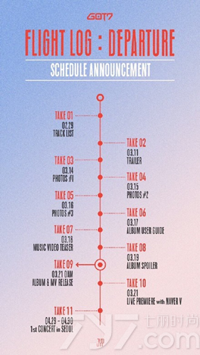 韩国时间26日0时,GOT7通过官方SNS公开了组合的超大规模回归计划日程预告,根据预告GOT7将于3月21日发表新迷你专辑《FLIGHTLOG:DEPARTURE》。
