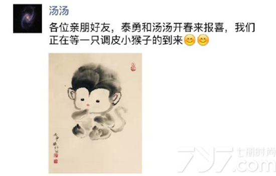 26日中午,汤唯发布消息,宣布自己已经怀孕:“各位亲朋好友,泰勇和汤汤开春来报喜,我们正在等一只调皮小猴子的到来。”
