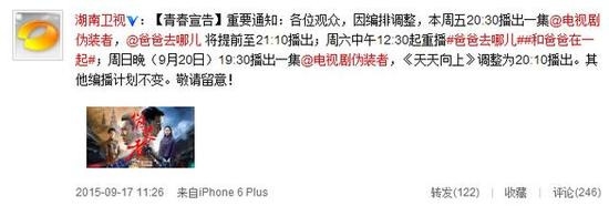 湖南卫视官方微博发文称,“因编排调整,本周五20:30播出一集电视剧《伪装者》,《爸爸去哪儿》将提前至21:10播出;周六中午12:30起重播《爸爸去哪儿》《和爸爸在一起》;周日晚(9月20日)19:30播出一集电视剧《伪装者》,《天天向上》调整为20:10播出。其他编播计划不变。”.