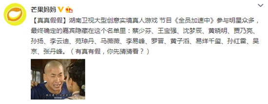 20日晚,微博账号芒果妈妈的爆料号,曝光了湖南卫视大型创意实境真人游戏节目《全员加速中》的嘉宾名单,蔡少芬、王宝强、沈梦辰、黄晓明、贾乃亮、孙扬、李云迪、苑琼丹、马薇薇、李易峰、罗晋、黄子韬、易烊千玺、孙红雷、吴京、张丹峰等众多明星榜上有名,该爆料号称,此份嘉宾名单之中有真有假。