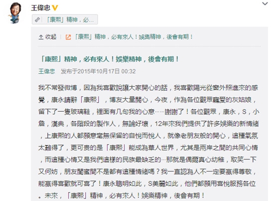 16日,《康熙来了》两大明星主持蔡康永和小S相继宣布退出这档已开播12年的台湾王牌综艺脱口秀。随后,《康熙来了》制作公司老板王伟忠在采访中表示尊重蔡康永的决定。17日凌晨,王伟忠发布一条微博,略带感慨的感谢了观众以及节目的主创人员。他还在结尾说道:“‘康熙’精神,必有来人!娱乐精神,后会有期!”