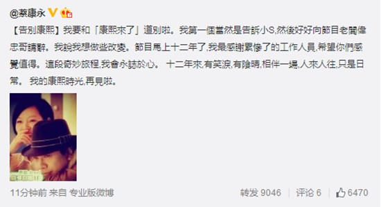 原文如下:我要和「康熙來了」道別啦。我第一個當然是告訴小S,然後好好向節目老闆偉忠哥請辭。我說我想做些改變。我最感謝累慘了的工作人員,希望你們感覺值得。這段奇妙旅程,我會永誌於心。 十二年來,有笑淚,有陰晴,相伴一場,人來人往,只是日常。 我的康熙時光,再見啦。