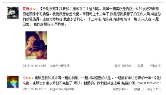 随后,搭档小S也发微博“康熙是我和康永哥一起的创作,一起共同经历的人生,一起拥有无法忘怀的十年,对我来说,康熙没有康永哥就不完整了!所以,亲爱的,我们就共进退啰!无论如何, love u forever~”,网友纷纷猜测随着小s和蔡康永双双退出,该节目也走向了终结。