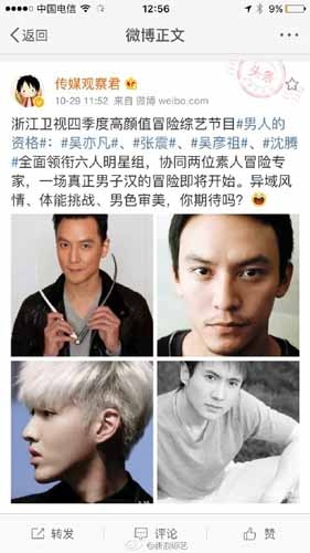 今日有微博爆料称,吴彦祖、张震、吴亦凡、沈腾将加盟浙江第四季度冒险综艺《男人的资格》,并协同两位素人冒险专家,展开一场男子汉冒险。虽然男神阵容超华丽,不过粉丝可能要失望了。新浪联系张震经纪公司,对方表示目前没这方面计划。至于其他男星,据悉档期上也比较困难。