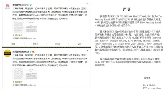 在深圳卫视热播了两季的真人秀节目《极速前进》,目前惨遭“山寨”,为此,美国原版制作方Profiles公司发布声明力证深圳卫视是中国境内独家享有节目版权的制作方,并携手起来共同抵制盗版,而由张艺领衔的第一季制作团队也将回归打造《极速前进3》。