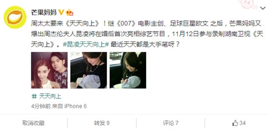 11日,据知情人士透露,继《007》电影主创、足球巨星欧文之后,又曝出周杰伦夫人新晋天王嫂昆凌将在婚后首次亮相综艺节目,11月12日参与录制湖南卫视《天天向上》。