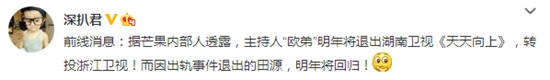 日前,关爱八卦协会爆料称“芒果内部人透露,缺席“双11晚会”的主持人欧弟明年将退出湖南卫视《天天向上》,转投浙江卫视,或将搭档王祖蓝主持全新综艺节目。”另外,因出轨而退出《天天向上》的田源或将于明年回归。