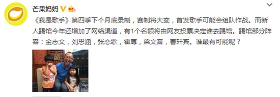 今日(17日),据芒果妈妈爆料,《我是歌手》第四季下个月底录制,赛制将大变,首发歌手可能会组队作战。而新人踢馆今年还增加了网络渠道,有1个名额将由网友投票决定谁去踢馆。