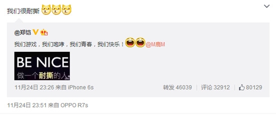 24日晚间,郑恺发微博称:“我们游戏,我们咆哮,我们青春,我们快乐!”并@鹿晗。随后,鹿晗转发此微博,写道:“我们很耐撕。”随后,不少网友留言称“不论怎样都支持你们”,但也有网友质疑这是炒作。