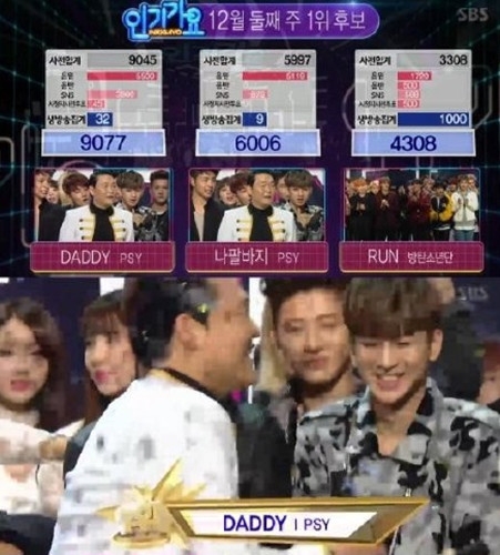 13日,PSY在自己的推特中公开了与YG后辈iKON在人气歌谣待机室的合照,另外,在《人气歌谣》的舞台,PSY强势回归,带来了《喇叭裤》&《Daddy》两首歌曲,与防弹少年团(BTS)一同成为了冠军候补。最终,PSY凭借歌曲《DADDY》以较大的优势击败了防弹少年团,获得了该期《人气歌谣》的冠军。