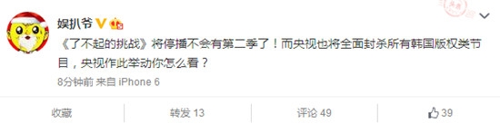 今日(19日)上午,据认证为娱扒爷的爆料号透露,《了不起的挑战》将停播不会有第二季了,而央视也将全面封杀所有韩国版权类节目。对此消息,网友纷纷大呼“不能接受”。此外,对于该消息的真实性,目前,央视还未就此做出回应。