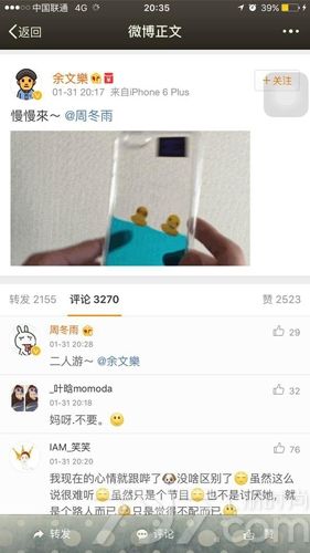 昨天晚上,余文乐推送了一条微博“慢慢来~@周冬雨”,并配上手机壳里的两只小鸭子逐渐靠近的gif,立刻引发网友热议。随后,周冬雨转发并回复了此条微博“二人游~@余文乐”。这可吓坏了不少不知情的网友:这是真在一起了吗?!