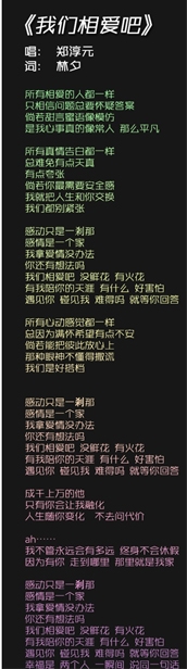 我们相爱吧与4月19日晚10点播出,三位夫妇将会全部亮相,今日,我们相爱吧官方微博公布了我们相爱吧主题曲,主题曲将由郑淳元全中文演唱,国内金牌作词人林夕填词,曲风温暖,作词唯美,很是适合我们相爱吧的主题。