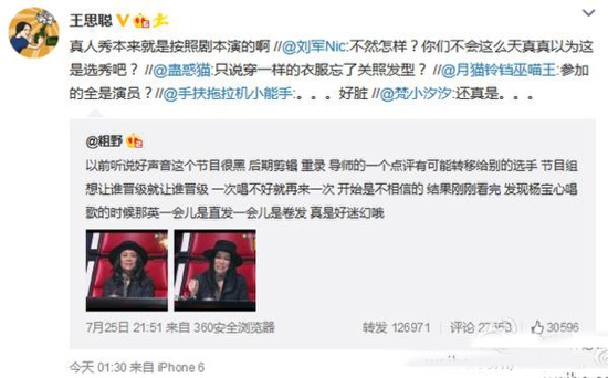 网友粗野表示:以前听说好声音这个节目很黑,后期剪辑、重录,导师的一个点评有可能转移给别的选手。好声音被曝黑幕,节目组想让谁晋级就让谁晋级,一次唱不好就再来一次。开始是不相信的,结果刚刚看完果然这样。王思聪后面转发该微博,称“真人秀本来就是按照剧本演的啊”,又引发网友热议,还有知情人称:晋级学员其实早就确定好了。不过这到底是真是假,小编也不得而知。