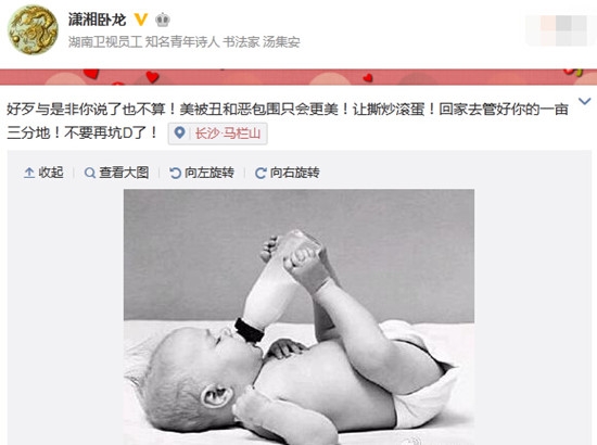 5日上午,湖南卫视员工汤集安(微博号“潇湘卧龙”)在微博上再回击:“好歹与是非你说了也不算!美被丑和恶包围只会更美!让撕炒滚蛋!回家去管好你的一亩三分地!不要再坑D了!”