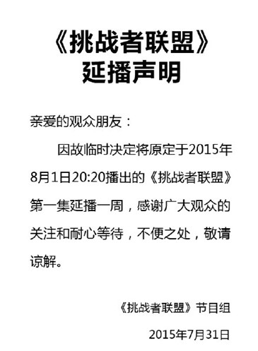 31日晚,浙江卫视《挑战者联盟》节目官方微博发文表示预计于8月1日播出的节目延期一周。