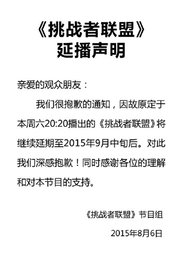 8月6日下午,浙江卫视《挑战者联盟》官方微博宣布,原定于本周六播出的《挑战者联盟》将继续延期至2015年9月中旬后。