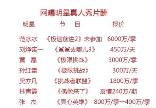 爆料提到,刘烨和诺一是《爸爸去哪儿》第三季里最贵的,一天价格是450万;《偶像来了》里林青霞参与节目带有公益性质,一期为240万,已经算是特别友情价,其他女明星一期都在120万以下,《极限挑战》孙红雷一天300万,黄磊3000万打包一季,《挑战者联盟》吴亦凡报价1800万一季,范冰冰则最贵,出场费每分钟6万。