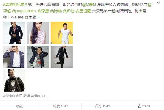 第三季进入筹备期,阳光帅气的鹿晗将加入跑男团,期待他与邓超、angelababy 、李晨、 陈赫 、郑恺 、王祖蓝六只兄弟一起向阳奔跑、跑出精彩!We are 伐木累!