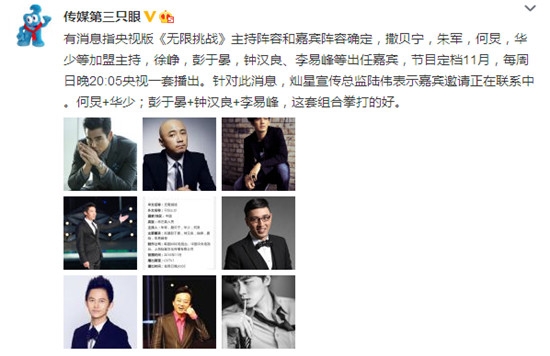 日前,有消息指出,央视版《无限挑战》主持阵容和嘉宾阵容确定,撒贝宁,朱军,何炅,华少等加盟主持,徐峥,彭于晏,钟汉良、李易峰等出任嘉宾,节目定档11月,每周日晚20:05央视一套播出。针对此消息,灿星宣传总监陆伟表示嘉宾邀请正在联系中。