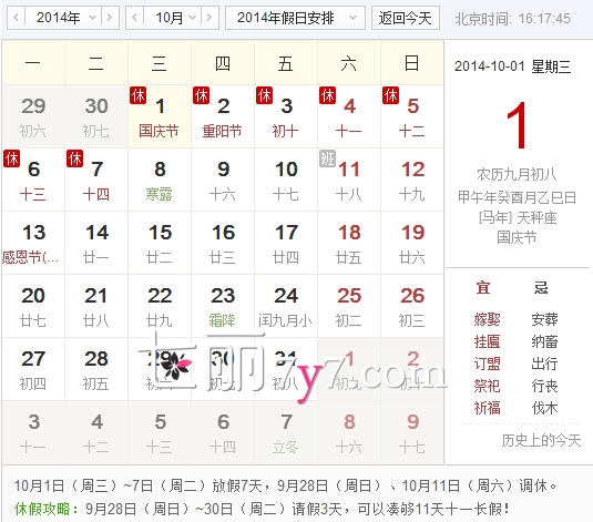 2014年10月1日国庆节即将到来,关于国庆节放假几天是上班族最关心的事,利用黄金周好好的出游放松心情是最佳的选择,下面就为大家分享2014国庆节放假通知!