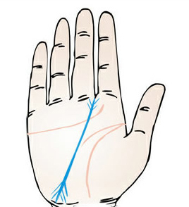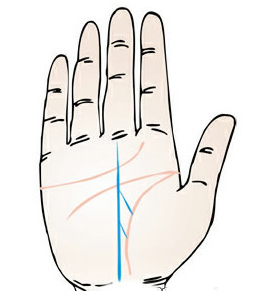 5.事业线分叉,从生命线延伸的副纹,且与事业线相交
