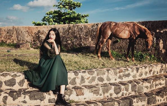 何穗最新街拍,灰色毛衣+墨绿色光泽感半裙,文艺慵懒,少女感十足。马海毛毛衣来自H&M,手提包和粉色毛拖鞋均来自Gucci,半裙来自Tibi 2016