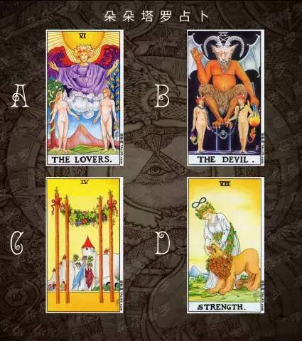 牌面D显示的是一位优雅的女性轻轻低下头去安抚身边的狮子,头顶上带着美丽的花环,这象征这一个她驾驭自然地能力,身旁的狮子,伸出舌头轻轻地舔着女人的手腕,只有她才能安抚自己的心灵,让自己得到一个宁静。
