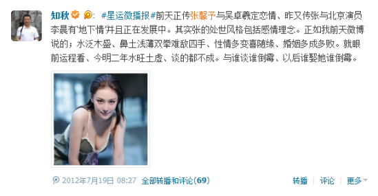 早在2012年7月星运微播报栏目中,知秋老师就说:“前天正传张馨予与吴卓羲定恋情、昨又传张与北京演员李晨有‘地下情’并且正在发展中。其实张的处世风格包括感情理念。正如我前天微博说的;水泛木盛、鼻土浅薄双拳难敌四手、性情多变喜随缘、婚姻多成多败。就眼前运程看、今明二年水旺土虚、谈的都不成。与谁谈谁倒霉、以后谁娶她谁倒霉。”如今一语成谶。