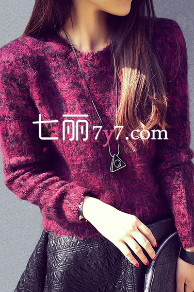 搭配亮点:紫红色毛衣+三角形毛衣