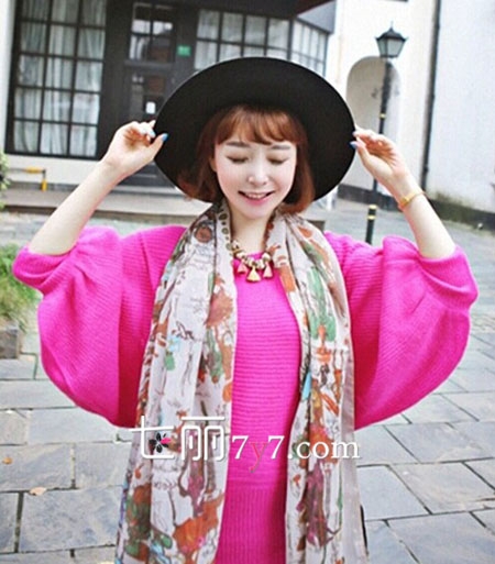 玫粉色的毛衣让你在人群中显得格外抢眼,时尚中袖的设计,略带些蝙蝠袖的元素,能很好的遮挡女生手臂上的肉肉,可是一样如此抢眼的衣服就这样穿出街难免会有些单调,选择一条时尚的项链搭配,垂坠感的设计很是吸引人,起到画龙点睛的作用。