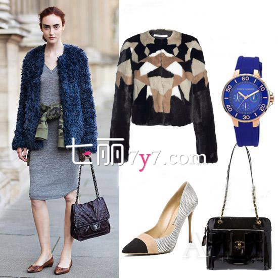 示范搭配:深蓝色皮草大衣+黑色菱格链条包