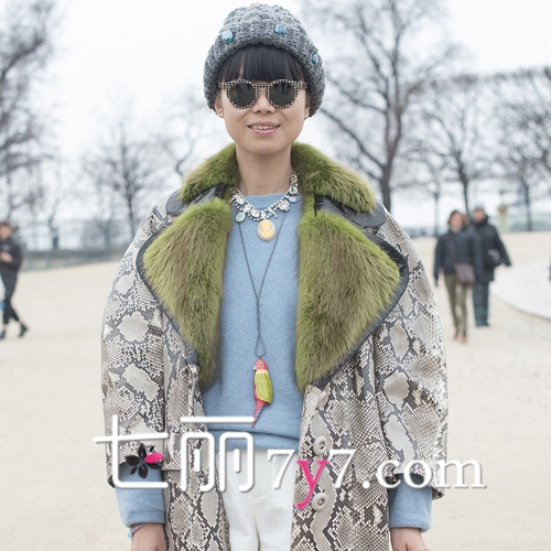 何穗最新街拍,灰色毛衣+墨绿色光泽感半裙,文艺慵懒,少女感十足。马海毛毛衣来自H&M,手提包和粉色毛拖鞋均来自Gucci,半裙来自Tibi 2016