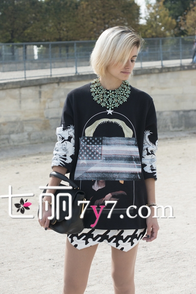 黑白极简的印花毛衣,用大气密集的花朵项链做搭配,成成叠叠的围绕在脖间,很是好看,用项链来和毛衣的图案进行混搭,展现出微小细节的精致之处。