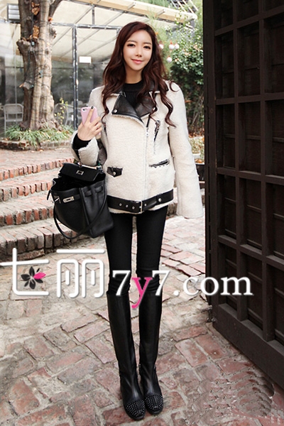 白色的短款外套十分清新,款式有些小帅气,细节之处拼接了皮革,在融入铆钉的元素,显得十分有个性,再搭配黑色紧身裤和长筒靴,整身造型显得女生十分高挑,手提一个黑色包包,简单穿搭出时髦女人味。