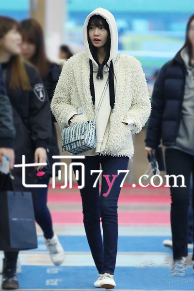 身穿毛茸茸外套的允儿看起来可爱极了,内搭白色的连帽卫衣,下穿深色的紧身牛仔裤,十分简单休闲的装扮,让其看起来十分的高瘦,再搭配一款浅蓝色的竖条纹包包,经典的包包款式,加上清新的色彩,春日搭配十分百搭实用。
