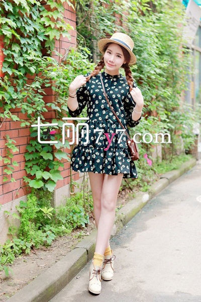 墨绿色碎花连衣裙衬衫款式和白色小碎花图案,上身效果很有小清新的感觉,荷叶边的裙摆设计,增添甜美感和时尚指数,光着搭配黄色短袜和绑带小皮鞋,戴上小草帽,尽显日系田园风格。背上酒红色mini单肩斜挎包,轻松出游又应景。